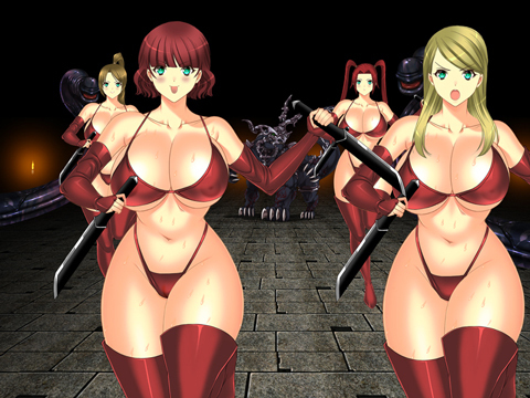 襲いかかる二人の女戦闘員。魔物が三体、女戦闘員が四体。